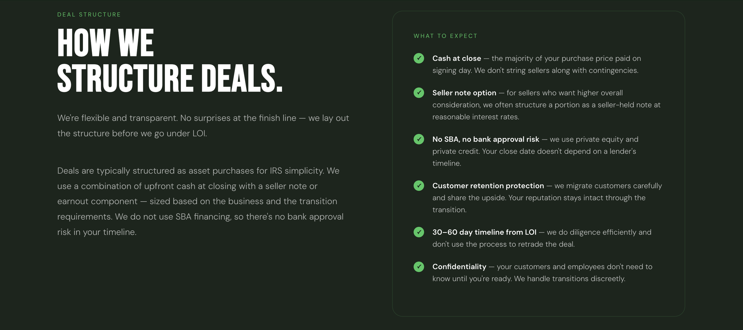 We buy from owner-operators, not just broker-represented deals. If you’re thinking about your next chapter, we’re worth a conversation — even if you’re not ready to sell just yet.