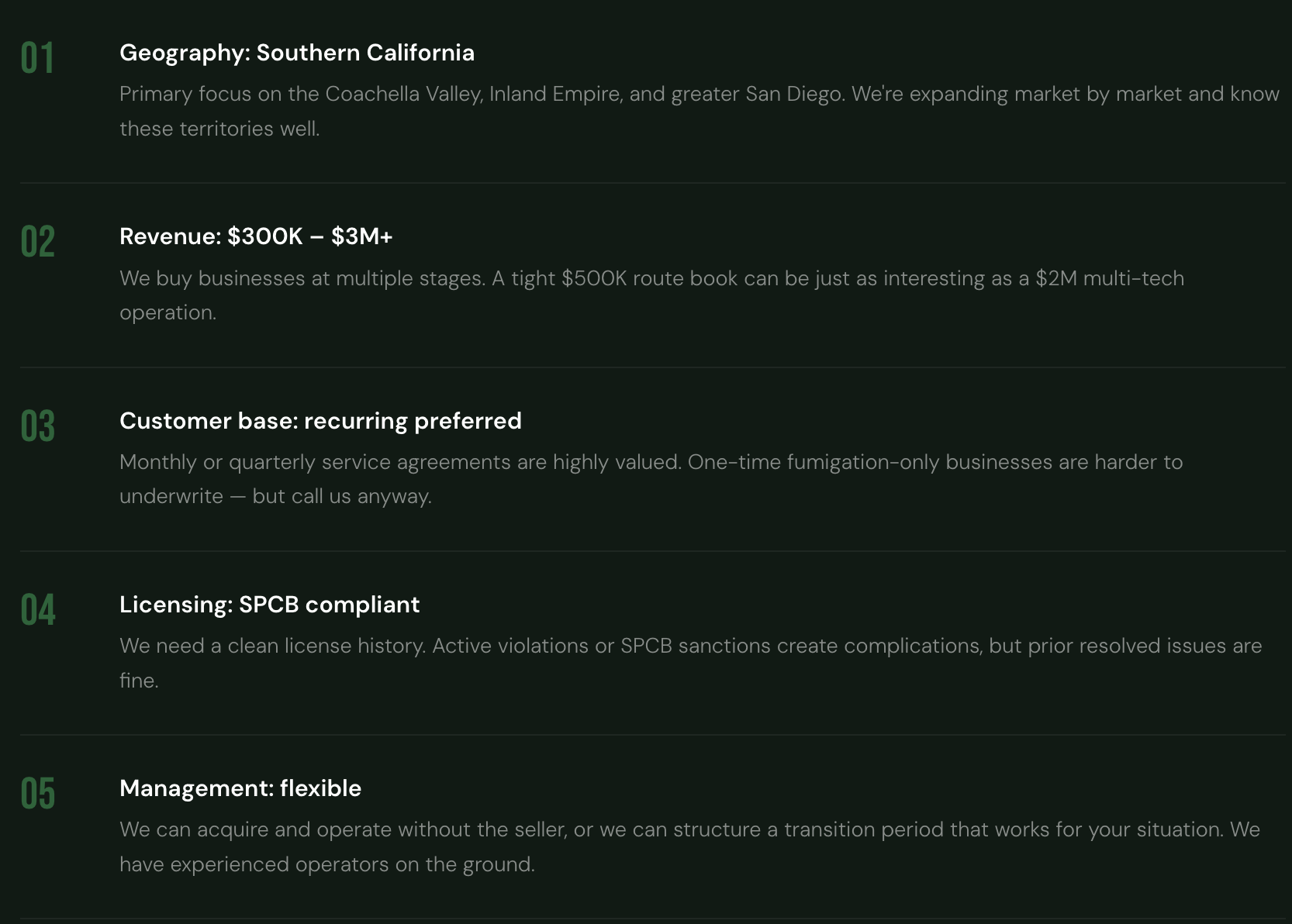 We work with intermediaries. We close on time, communicate clearly, and don't retrade. If you have a pest control business in Southern California between $500K and $5M in revenue, we want to hear from you.